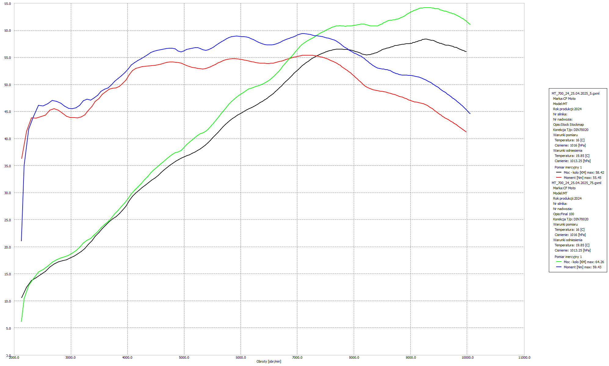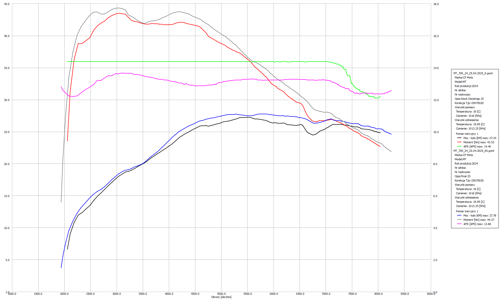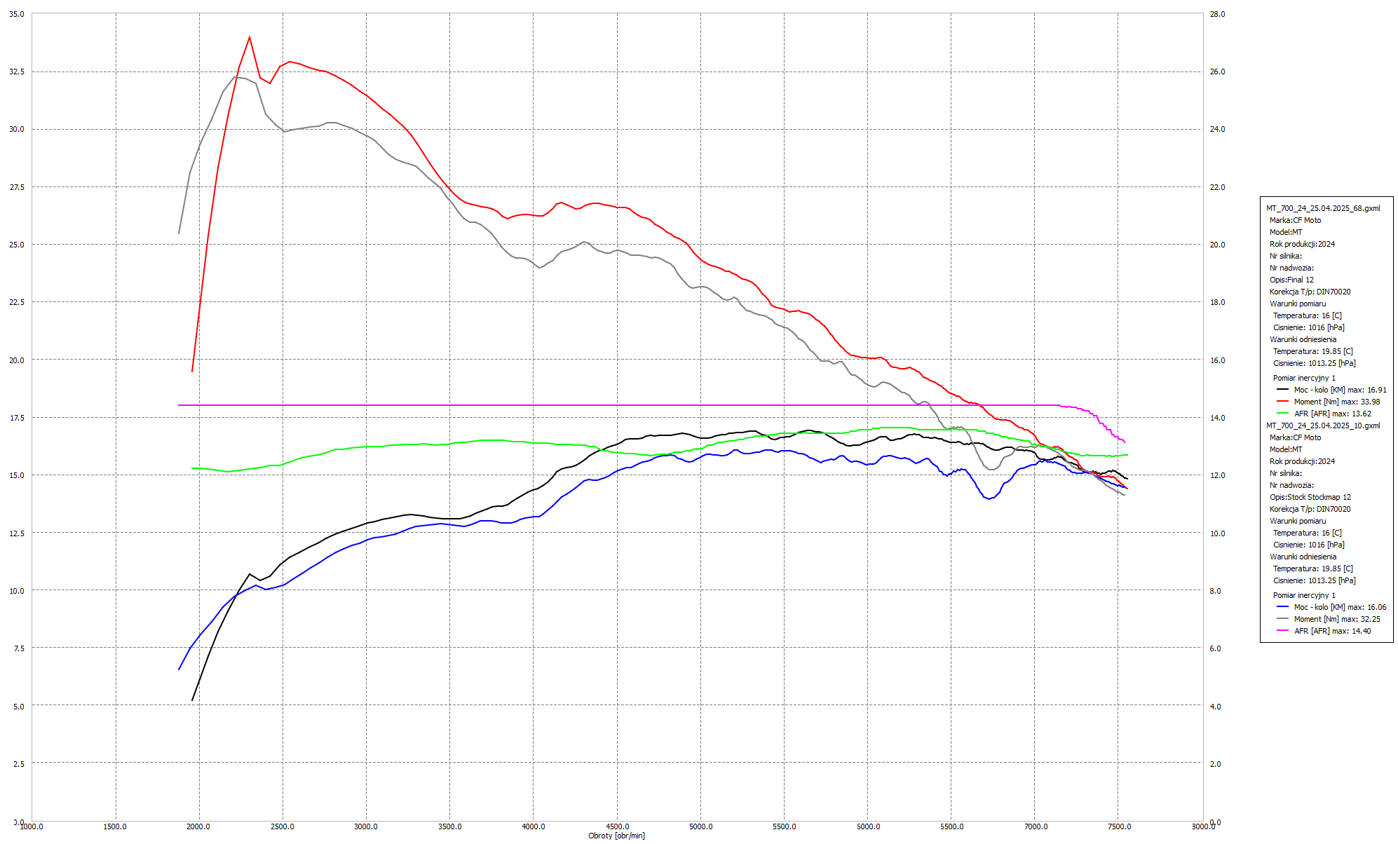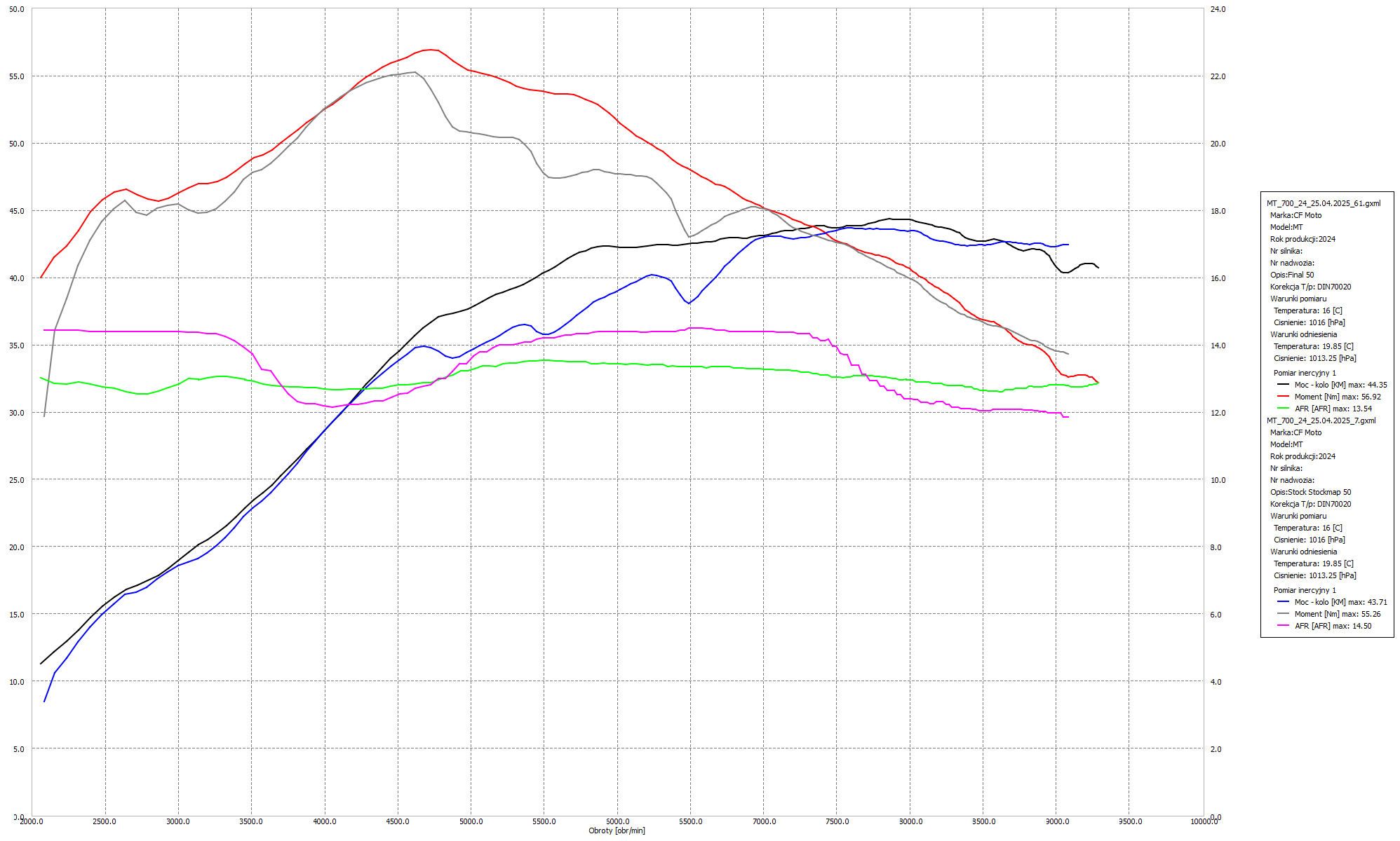 Podczas pracy nad tym egzemplarzem skupiliśmy się na pełnym odblokowaniu jego potencjału, który fabrycznie był ograniczony ze względu na normy emisji oraz wymogi homologacyjne. Przeprowadziliśmy modyfikację oprogramowania ECU, eliminując fabryczne ograniczenia mocy i momentu obrotowego na niższych biegach. Dostosowaliśmy mapy paliwa oraz zapłonu tak, aby silnik pracował płynniej i z większą dynamiką w całym zakresie obrotów. Poprawiliśmy również reakcję na gaz – dzięki temu manetka stała się bardziej precyzyjna i przewidywalna, co ułatwia jazdę zarówno w mieście, jak i podczas agresywniejszych wypadów w teren. Wyregulowaliśmy także AFR, eliminując problemy z nadmiernie ubogą mieszanką na niskich obrotach, co wyraźnie poprawiło elastyczność.