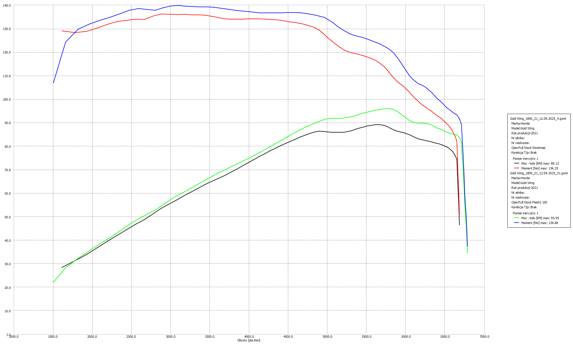 Podczas naszej pracy skupiliśmy się na poprawie reakcji silnika oraz wyeliminowaniu ograniczeń fabrycznych. Te ograniczenia utrudniały pełne korzystanie z możliwości. Zajęliśmy się korektą map paliwowych oraz dostosowaniem zapłonu, aby jednostka pracowała jeszcze bardziej harmonijnie. Dzięki odpowiedniemu dostrojeniu ECU Goldwing GL1800 zyskał lepszą elastyczność w całym zakresie obrotów. Przy tym jazda stała się płynniejsza i bardziej naturalna. Udało się też wydobyć dodatkową dawkę mocy. To sprawiło, że motocykl przyspiesza zdecydowanie pewniej – zarówno solo, jak i z pasażerem i pełnym bagażem.